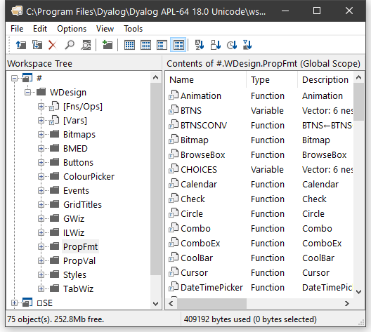 The TreeView displays the structure of your workspace. Initially it shows the root and Session namespaces # and ⎕SE. The icon for # is open indicating that its contents are those that appear in the ListView. You can expand or collapse the TreeView of the workspace structure by clicking on the mini-buttons (labelled + and -) or by double-clicking the icons. A single click on a namespace icon opens it and causes its contents to be displayed in the ListView. Another way to open a namespace is to double-click its icon in the ListView. Only one namespace can be open at a time. The icons used in the display are described below.