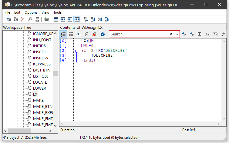 If you open the Fns/Ops item, the names of the functions and operators in the namespace are displayed below it alphabetically in the left (tree view) pane. When you select one of these names, the function itself is opened in the right (list view) pane.