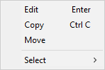 The Edit menu, illustrated above, provides the following actions. The Edit, Copy and Move operations act on the object or objects that are currently selected in the ListView.