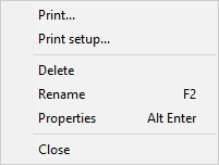 The File menu, illustrated above, provides the following actions. All but Print setup and Close act on the object or objects that are currently selected in the ListView.