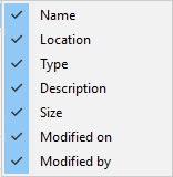 The ListView displays the contents of a namespace in one of four different ways namely Large Icons view, Small Icons view, List Icons view or Details view. You can switch between views using the View menu or the tool buttons that are provided. In the first three views, the system displays the name of the object together with an icon that identifies its type. In Details view, the system displays several columns of additional information. You may resize the column widths by dragging or double-clicking the lines in the header. To hide a column, drag its width to the far left. The additional columns are: